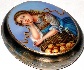 This attractive oval box is a creation of Mishin from the village of Fedoskino. It features a pretty girl dressed in the Russian peasant costume leaning against the basket of apples.