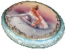 The scene is framed with a nice, brilliant gold wavy pattern. Two parallel gold lines decorate the box's sides. The box's exterior is of delicate light blue color, and adorned with an innumerable number of silver veins. The interior is traditionally red. On the box's interior bottom a small piece of mother-of-pearl is glued. A small shell is attached in the middle of the box's body for ease of opening.