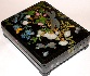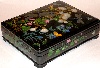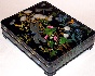 The box is constructed from paper-mache. Black lacquer covers the exterior and red lacquer covers the interior of the box. A hinge is fastened to the left of the composition. The box rests on legs. The work is signed with the name of the artist, and the year of 2007.