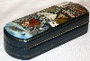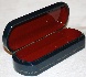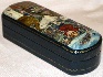 The box is made out of paper-mache. Blue lacquer mixed with gold dust covers the exterior, and red lacquer covers the interior of the box. The box has a hinge to its left and rests on a flat bottom. The work is signed with the artist's name, and the title (