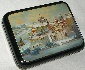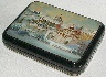 The box is constructed out of paper-mache. Black lacquer covers the exterior and red lacquer covers the interior of the box. The lid is hinged from the top of the composition, and the box rests on a flat bottom. The work is signed with the artist's name, Fedoskino and the year of 2008.
