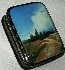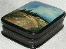 The scene is masterfully painted in the realistic style using blue, green and brown tones of oils. A piece of mother-of-pearl is set into the puddle depicted in the foreground to create its brilliance. A nice gold pattern is used to decorate the edges of the lid, and the box's sides.