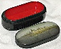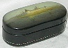 The box is made out of paper-mache. Black lacquer covers the exterior and red lacquer covers the interior of the box. The lid isn't hinged, and the box rests on four rounded feet. The work is signed with the artist's name, Fedoskino, and the year of 2003 on the box's exterior bottom.