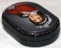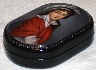 The box is made out of high quality paper-mache. Black lacquer covers the exterior and red lacquer covers the interior of the box. The lid is hinged from the left of the portrait, and the box rests on a flat bottom. The work is signed with the artist's name, the village of Fedoskino, and the year of 2008.