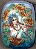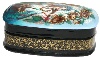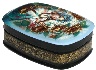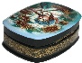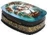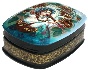 Here the artist makes fine use of the overlay method of application. This procedure helps her to develop texture and three dimensional features throughout. A magnificent effect! The bright golden blossoms of sunflowers contrast beautifully with blue greenish tones of the girl's costume and the surrounding landscape. The box gleams richly with a combination of mother-of-pearl, gold paint and aluminum powder. Using mother-of-pearl and gold paint the artist achieves luxurious texture of the sarafan. Gold paint is also used to paint the sunflowers. Using aluminum powder the artist highlights the girl's sarafan, the foliage of sunflowers and the white background.