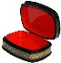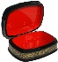 The box is constructed of paper-mache. The interior of the box is covered with red lacquer, the box's exterior is covered with black lacquer. A hinge is fastened to the left of the lid. The box rests flat without feet. It is signed and titled by the artist.