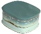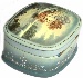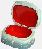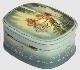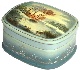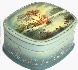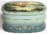 The exterior of the box is covered with light blue oils that tone with the composition painted in the gray bluish shades. Elegant gold ornamentation accented with white oils frames the composition. The sides of the box are decorated with more complex designs composed of snowflakes. They are also painted in gold and accented with white oils. The box's interior is traditionally red.