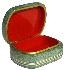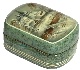 The scene is framed with a white line; white and gold lines wrap around the box's sides. The box's exterior imitates the coloring of blue marble (dark green and blue tiny veins are scattered against the light blue background). The interior is traditionally red. The edges of the lid's interior and the edges of the interior of the box's body are outlined with gold.