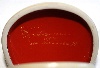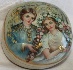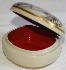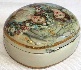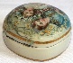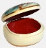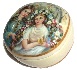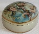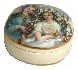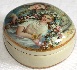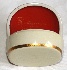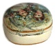 The composition is framed with the ribbon cut out of the gold metal leaf. Another ribbon cut out of the gold metal leaf wraps around the sides of the box. The exterior of the box is covered with cream oils, while the interior is traditionally red.