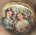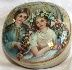 Description: This attractive small box was created by talented Fedoskino painter Julia Goryunova. It shows a loving couple dressed in festive clothes. A young boy is dressed in the blue caftan, and a girl is dressed in the beautiful white dress, her head is covered with the garland of wild flowers.