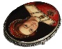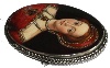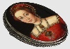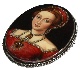 Description: Valentina Maslova from the village of Fedoskino is the creator of this beautiful brooch. On the oval piece of mother-of-pearl the artist has painted her interpretation of the famous portrait of Queen Elizabeth I originally painted in 1546, by William Scrots. This portrait can be viewed at Windsor Castle. This very beautiful portrait was sent as a gift to Elizabeth's half-brother, King Edward VI. The letter accompanying the gift was quite touching. Elizabeth wrote: