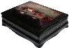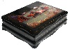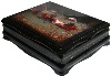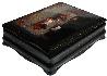 The box is constructed from paper-mache. Black lacquer covers the exterior and red lacquer covers the interior of the box. A hinge is fastened to the top of the composition. The box rests on wavy platform. The work is signed with the name of the artist.