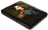 The box is constructed from paper-mache. Black lacquer is used to paint the exterior of the box while red lacquer completes the interior of the work. The lid is hinged from the left of the portrait, and the box rests on a flat bottom. The work is signed with the artist's name.