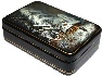 The box is constructed from paper-mache. Black lacquer is used to paint the exterior of the box while red lacquer completes the interior of the work. A hinge is fastened to the left of the scene, and the box rests on a flat bottom. The work is signed with the artist's name, and the village of Fedoskino.