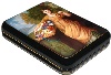 The box is constructed from paper-mache. Black lacquer is used to paint the exterior of the box while red lacquer completes the interior of the work. The lid is hinged from the left of the portrait, and the box rests on a flat bottom. The work is signed with the artist's name.