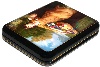 The portrait is framed with a gold line as well as the sides of the box are decorated with two gold parallel lines.