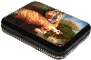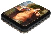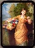 Description: This portrait of a beautiful woman who holds pink, yellow and red flowers inside of her tray is wonderful creation of talented Fedoskino artist Tatiana Gomzina. The portrait is masterfully executed: tone, shade and light are perfect. The woman's face glows with happiness that is so difficult to achieve in a lacquer miniature portrait.