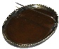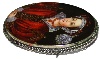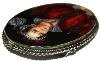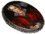 Valentina Maslova from the village of Fedoskino is the creator of this beautiful brooch. On the oval piece of mother-of-pearl the artist has painted her interpretation of the world famous portrait of Catherine Parr originally painted in1545 by unknown English artist. This masterpiece is exhibited in the National Portrait Gallery in London.