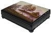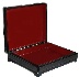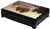 The box is constructed from paper-mache. Black lacquer is used to paint the exterior of the box while red lacquer completes the interior of the work. The lid is hinged to the top of the scene, and the box rests on a four legs. The work is signed with the artist's name in the corner of composition.