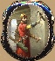 Bright red oils are used to paint the costume of the falconer while the background is painted in light grey tones. Silver powder shines through the falconer's sleeves, his hat and is also used to highlight the far background.