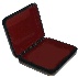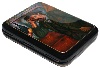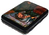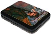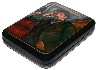 The box is constructed from paper-mache. Black lacquer is used to paint the exterior of the box while red lacquer completes the interior of the work. The scene is framed with a gold line while the box's sides are decorated with two parallel gold lines. The lid is hinged from the left of the portrait, and the box rests on a flat bottom. The work is signed with the artist's name.