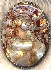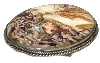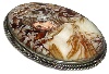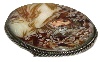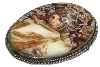 Valentina Maslova from the town of Dmitrov has been painted this splendid brooch. On the oval piece of mother-of-pearl the artist has painted the gorgeous reproduction of the painting "Winter" by Alphonse Mucha, the famous ART NOUVEAU artist! Mother-of-pearl shines beautifully through the oils and creates a sparkle of the woman's costume and the background! The oval pearl plate on which the portrait is painted is set into the frame made out of German silver. The portrait is framed with swirling metal patterns. The work is signed with the artist's name, Fedoskino and the year of 2010.