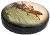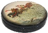 Description: This round shaped box has been created by N. Novikova from the village of Fedoskino. It features the traditional theme of a Russian winter troika. The troika rushes along the desert expanses of Russian countryside and its passengers look absolutely happy.