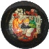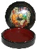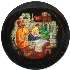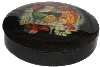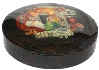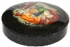 Description: This round shaped box has been created by S. Brozhenkova from the village of Fedoskino. It features the interior of a Russian peasant house and its dwellers, an old man and an old woman. The scene is painted in various tones of oils. Some of the details are enhanced with brilliant gold paint.