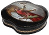 The box is constructed from paper-mache. Black lacquer is used to paint the exterior of the box while red lacquer completes the interior of the work. The exterior is decorated with rich gold ornaments. A hinge is fastened to the top of the portrait, and the box rests on a flat bottom. The work is signed with the artist's name, Fedoskino and the year of 2010.