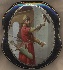 Bright red oils are used to paint the costume of the falconer while the background is painted in light grey tones. Silver powder shines through the falconer's sleeves, his hat and is also used to highlight the far background.