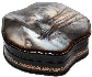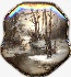 The scene is masterfully drawn in various shades of gray and light brown oils. A piece of mother-of-pearl shines through snow covered trees.