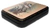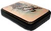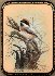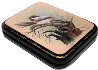 Medvedeva from the village of Fedoskino is fond of birds, and has created a series of works painted on this theme. Here she has depicted a Woodchat Shrike sitting on the tree. The noble scarlet feathering of the depicted bird contrast beautifully with the delicate, peach background and the brown color of the tree. Aluminum powder shines in the middle of the scene to focus the viewer's attention on the depicted bird.