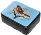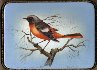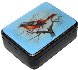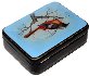Description: Artist Mashkova from the village of Fedoskino is fond of birds, and has created a series of works painted on this theme. Here she has depicted a Siberian Redstart sitting on the branch of a tree. The noble scarlet and gray feathering of the depicted bird contrast beautifully with the delicate light blue background. Aluminum powder shines in the middle of the scene to focus the viewer's attention on the depicted bird!