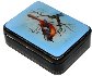 The box is constructed from paper-mache. Black lacquer is used to paint the exterior of the box while red lacquer completes the interior of the work. The lid is hinged from the top of the scene, and the box rests on a flat bottom. The edges of the lid and the sides of the box are decorated with a simple gold pattern. The work is signed with the artist's name, name of the bird "Siberian Redstart" and the year of 2011.