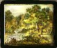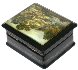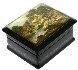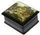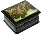 Description: This peaceful landscape has been painted by Fedoskino artist A.G. Zakharov. The scene is dominated by a large oak that overlooks a small stream. The colors taken from the palette are very natural and realistic, which enhances the quality of the landscape in the way it was rendered. Earthtone paints make up the basis for the palette. Deep greens, light-greens and grays are the three primary colors used. The details show an expansive landscape that is full of diverse plant-life. To give the illusion of lush grass, and thick growth in the forest, Zakharov uses a technique used by watercolor artists that uses minute variations in solid areas of paint so the land and trees look very fertile. The background is painted vaguely, according to the rules of perspective, whereas the trees and plants in the foreground are pained distinctly and precisely. Gold metallic powder is used to highlight the trees and the grass to create the effect of sunlight. Aluminum powder is used to paint the ripple surface the river which reflects the gray sky.