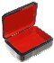 The box is constructed from paper-mache. Black lacquer is used to paint the exterior of the box while red lacquer completes the interior of the work. The lid is hinged from the left of the portrait, and the box rests flat. The work is signed with the artist's name.
