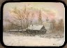The scene is painted in white and light gray oils suitable for reproduction of a dull winter day. Mother-of-pear is set into the sky to create a rose glow of the sunset, and to enliven the scene. Copulas of a small village Church are covered with a snow as well as the roofs of the wooden houses.