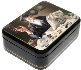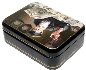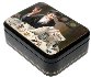 The box is constructed out of paper-mache. Black lacquer covers the exterior and red lacquer covers the interior of the box. The box has a hinge from the top of the portrait, and rests on a flat bottom. The box is signed with the artist's name.