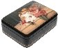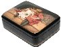 The box is constructed from paper-mache. Black lacquer is used to paint the exterior of the box while red lacquer completes the interior of the work. The scene is framed with a gold line while the box's sides are decorated with two parallel gold lines. The lid is hinged from the top of the scene, and the box rests on a flat bottom. The work is signed with the artist's name, Fedoskino and the year of 2011.