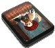 The box is constructed from paper-mache. Black lacquer is used to paint the exterior of the box while red lacquer completes the interior of the work. A hinge is fastened to the left of the portrait, and the box rests on a flat bottom. The work is signed with the artist's name.