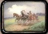 Description: Yevgeniy Potekhin is the author of this traditional Fedoskino box that features a woman riding in the carriage. Clouds are getting heavier and heavier and looks like the rain is coming. The coachman whips the three horses with the reins making them race faster. On the back of the composition we can see beautiful summer landscape and the trees at the edge of a forest.