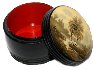 The box is constructed from paper-mache. Black lacquer is used to paint the exterior of the box while red lacquer completes the interior of the work. The lid has no hinge, and the box rests on a flat bottom. The work is signed with the artist's name, Fedoskino and the year of 74 (1974). Good shape for 1974 year.