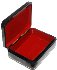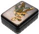 The box is constructed from paper-mache. Black lacquer is used to paint the exterior of the box while red lacquer completes the interior of the work. A hinge is fastened to the left of the scene, and the box rests on a flat bottom. Signed with the artist's pseudonym (Loris), and the village of Fedoskino.