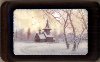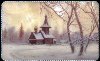 The scene is painted in white and light gray oils suitable for reproduction of a dull winter day. Mother-of-pear is set into the sky to create a glow of the sunset, and to enliven the scene. Copulas of a small village Church are covered with a snow as well as the roofs of the wooden houses.
