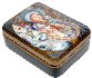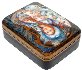 The composition is painted in bright blue oils. Gold paint shines through the designs of the girl's costume and also through some of the plants. Also gold paint is used to decorate the box's exterior with lustrous, wide bands running along the box's sides.