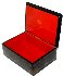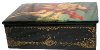 The box is constructed from paper-mache. Black lacquer is used to paint the exterior of the box while red lacquer completes the interior of the work. The box's sides are decorated withe intricate gold flower pattern. The lid is hinged to the left of the scene, and the box rests on a flat bottom. The work is signed with the artist's name, Fedoskino and dated 1998.