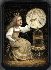 The box features the girl with a crown who conducting the bird. The full moon shines brightly and the black sky is studded with myriads of stars. The bird sit on the rod ath top of the cageand its painted against the bright full moon.