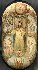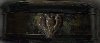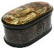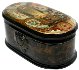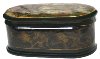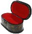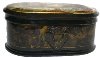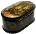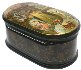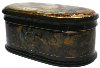 The box is made out of paper-mache. Black lacquer covers the exterior and red lacquer covers the interior of the box.The sides of the box are decorated with mixture of colors, that imitates the brown marble. On the right side of the box we can see sculpture of the coat of arms of Russia, but for some reason painted in the same marble color.