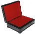 The box is constructed from paper-mache. Black lacquer is used to paint the exterior of the box while red lacquer completes the interior of the work. A hinge is fastened to the left of the composition, and the box rests on four legs.