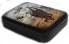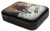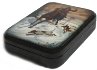 White and brown colors are dominated here, as a hunt is taking place in winter.The skies above the hunter are shins with gold as they were made of a real pieces of thin gold glued on the box.